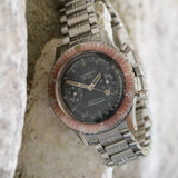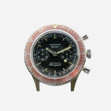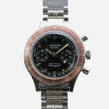 Wittnauer chronographs are becoming very popular among vintage collectors. The reference 7004A has great "modern" proportions. At 40mm it looks great on most wrists. The contrast between the matte black dial and rotating burgundy bezel makes this piece instantly recognizable and this example's bezel has faded very nicely over the years which adds to a unique touch to this piece.