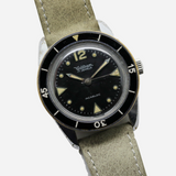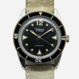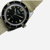 The story goes, the US based Waltham Watch Company established a subsidiary under the name Waltham International SA Switzerland in 1954, just a few years before the US factory doors closed. Shortly thereafter, the subsidiary Waltham Switzerland established a partnership with Blancpain to bring their pioneering Fifty Fathoms dive watch to the US market, under the well established Waltham name. From there, the story remains somewhat untold. Waltham branded examples of Blancpain's Bathyscaphe, a model that was introduced in the late 1950s and popularized in the 1960s, like the one we have here, tell us the subsidiary remained functioning in Switzerland after its parent went under. - Hodinkee