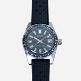 Released in 1965 the “62MAS” (auto[MA]tic [S]elfdater) is the first professional Seiko diver's watch. Originally released with a smaller crown (ref. 6217-8000) this was discontinued after two months and replaced with (ref. 6217-8001) which has a larger crown.