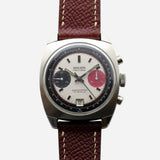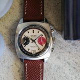 Cased in a 37mm stainless steel case with a beautiful reverse panda style dial. This Gruen is powered by the Valjoux 7734 chronograph movement.