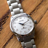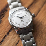 The dial is a beautiful white colour with polished Breguet numerals and a heated blue seconds hand. This piece has the now discontinued double signed Seiko/ Grand Seiko logos which balances out the dial perfectly. Very rarely seen on the pre owned market this truly is a special opportunity for any watch collector.