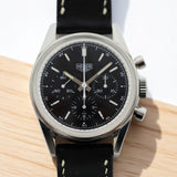 The Carrera Ref. CS3111 is a mirror image of the first Carrera released in 1964. This reissue is nearly identical to the original, featuring the same 36mm case, pump pushers, acrylic crystal, and three-register dial layout.