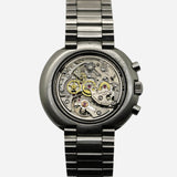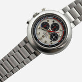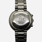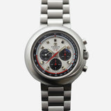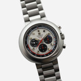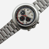 The Tissot T12 chronograph has a typical 1970’s case shape. At 44mm its rounded cushion resembles a UFO. The lugs are completely enclosed in the shapely case thus making the bracelet appear to be integrated.